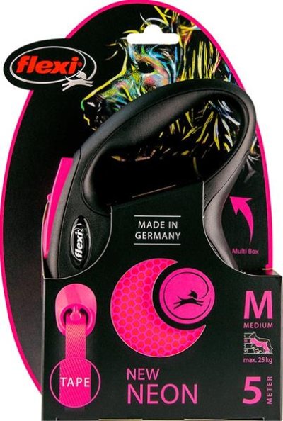 New Neon je vynikajúce vodítko, ktoré vďaka reflexným nálepkám a neónovo sfarbeným prvkom vyniká za všetkých poveternostných podmienok. Reflexné nálepky odrážajú svetlomety vo vzdialenosti viac ako 150 m. Vďaka neónovo sfarbeným prvkom ste lepšie videní, ste vo väčšom bezpečí! Vy a Váš pes patríte k sebe ako jeden tím! Ľudia Vás uvidia už z diaľky. Vylepšený brzdový systém s krátkym zdvihom umožňuje viac kontroly. Možno pridať (od veľkosti S) aj Multi Box na ukladanie maškrty či sáčkov. Rodinná firma flexi vyrába výhradne na území Nemecka. V závode v Bargteheide pri Hamburgu vzniká všetko, počnúc návrhom až po výrobu vysoko kvalitných vodítok – Made in Germany. Firma flexi je vynálezcom samonavíjacieho vodítka a jednotkou na svetovom trhu, exportuje do viac ako 90 krajín sveta. Originálne samonavíjacie vodítka flexi sa vyznačujú patentovaným, po technickej stránke najmodernejším pružinovým systémom a komfortným ovládaním. Sú vyrábané z vysoko kvalitných materiálov, exkluzívne manuálne spracované a zostavené. Vodítka prechádzajú pred expedíciou mnohými kontrolami kvality. Veľkosť: M – vhodné pre psy s hmotnosťou do 25 kg. Typ vodítka: Navíjací – opasok. Dĺžka opasku/lanka: 5 m Farba: ružová