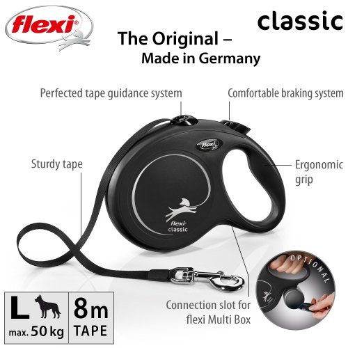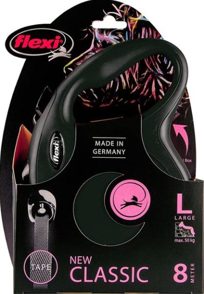 Vodítka flexi® classic ponúkajú pohodlný úchop, odolný navíjací systém aj kvalitný, bezpečný a intuitívny brzdný systém, ktorý v zlomku sekundy zastaví pohyb psa. Pre ľahké upevnenie vodidla k obojku alebo postroju je vodítko opatrené chrómovanou karabínou. Samozrejmosťou je zdokonalený výstup pásky, ktorý zaisťuje manipuláciu v ľubovoľnom smere bez zasekávania - potvrdené nespočetnými testami.