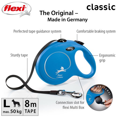 Vodítka flexi® classic ponúkajú pohodlný úchop, odolný navíjací systém aj kvalitný, bezpečný a intuitívny brzdový systém, ktorý v zlomku sekundy zastaví pohyb psa. Pre ľahké upevnenie vodidla k obojku alebo postroju je vodítko opatrené chrómovanou karabínou. Samozrejmosťou je zdokonalený výstup pásky, ktorý zaisťuje manipuláciu v ľubovoľnom smere bez zasekávania - potvrdené nespočetnými testami.