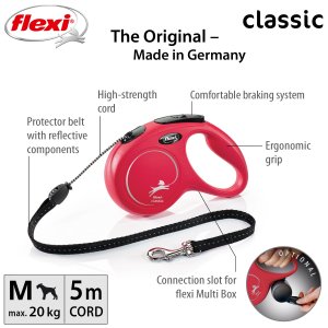 Vodítka flexi® classic ponúkajú pohodlný úchop, odolný navíjací systém aj kvalitný, bezpečný a intuitívny brzdný systém, ktorý v zlomku sekundy zastaví pohyb psa. Pre ľahké upevnenie vodidla k obojku alebo postroju je vodítko opatrené chrómovanou karabínou. Moderný dizajn je možné zároveň kombinovať s praktickými doplnkami flexi® Multi Box a flexi® LED osvetlením (okrem veľkosti XS).