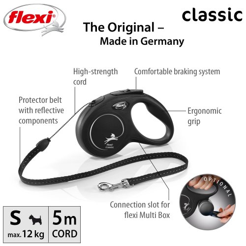 Vodítka flexi® classic ponúkajú pohodlný úchop, odolný navíjací systém aj kvalitný, bezpečný a intuitívny brzdný systém, ktorý v zlomku sekundy zastaví pohyb psa. Pre ľahké upevnenie vodidla k obojku alebo postroju je vodítko opatrené chrómovanou karabínou. Moderný dizajn je možné zároveň kombinovať s praktickými doplnkami flexi® Multi Box a flexi® LED osvetlením (okrem veľkosti XS).