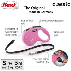 Vodítka flexi® classic ponúkajú pohodlný úchop, odolný navíjací systém aj kvalitný, bezpečný a intuitívny brzdný systém, ktorý v zlomku sekundy zastaví pohyb psa. Pre ľahké upevnenie vodidla k obojku alebo postroju je vodítko opatrené chrómovanou karabínou. Moderný dizajn je možné zároveň kombinovať s praktickými doplnkami flexi® Multi Box a flexi® LED osvetlením (okrem veľkosti XS).