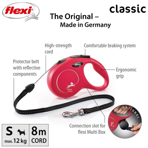 Vodítka flexi® classic ponúkajú pohodlný úchop, odolný navíjací systém aj kvalitný, bezpečný a intuitívny brzdný systém, ktorý v zlomku sekundy zastaví pohyb psa. Pre ľahké upevnenie vodidla k obojku alebo postroju je vodítko opatrené chrómovanou karabínou. Moderný dizajn je možné zároveň kombinovať s praktickými doplnkami flexi® Multi Box a flexi® LED osvetlením (okrem veľkosti XS).