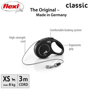 Vodítka flexi® classic ponúkajú pohodlný úchop, odolný navíjací systém aj kvalitný, bezpečný a intuitívny brzdný systém, ktorý v zlomku sekundy zastaví pohyb psa. Pre ľahké upevnenie vodidla k obojku alebo postroju je vodítko opatrené chrómovanou karabínou. Moderný dizajn je možné zároveň kombinovať s praktickými doplnkami flexi® Multi Box a flexi® LED osvetlením (platí pre veľkosť S, M a L).