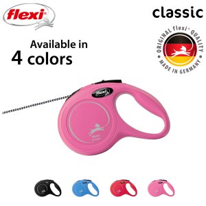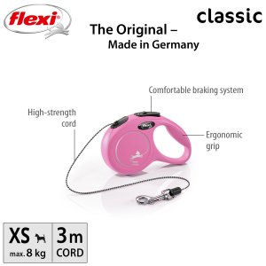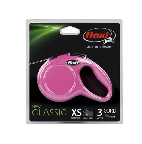 Vodítka flexi® classic ponúkajú pohodlný úchop, odolný navíjací systém aj kvalitný, bezpečný a intuitívny brzdový systém, ktorý v zlomku sekundy zastaví pohyb psa. Pre ľahké upevnenie vodidla k obojku alebo postroju je vodítko opatrené chrómovanou karabínou.