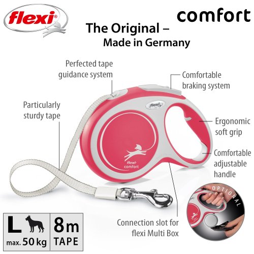 Pohodlné a vďaka svojmu dokonale zladenému dizajnu aj unikátne - to je vodítko flexi® c omfort , ktoré ponúka Vášmu štvornohému priateľovi všetko, čo psy milujú: pohyb, pohyb a ešte raz pohyb! Vás určite poteší extra pohodlná, mäkká rukoväť (vo veľkosti M a L je navyše nastaviteľná) aj zdokonalený výstup a vedenie pásky všetkými smermi bez zasekávania. Na každej prechádzke oceníte aj bezpečný a intuitívny brzdový systém, ktorý v zlomku sekundy zastaví pohyb psa. Pre ľahké upevnenie vodidla k obojku alebo postroju je vodítko opatrené kvalitnou chrómovanou karabínou.