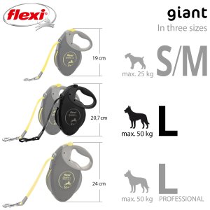 Flexi® má srdce pre veľké psy! Vodítko flexi® Giant L je navrhnuté pre silných a aktívnych psov až do hmotnosti 50 kg a ponúka voľný pohyb do vzdialenosti 8 metrov. A čo Vám ponúka? Mäkkú rukoväť na dlhé výlety a tréningy a mnoho ďalších benefitov: