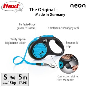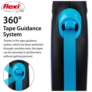 Flexi® Neon zároveň ponúka aj nespočetnými testami zdokonalený výstup a vedenie pásky všetkými smermi bez zasekávania. S dĺžkou 5 m poskytuje Vášmu parťákovi potrebnú voľnosť pohybu.