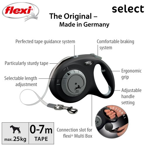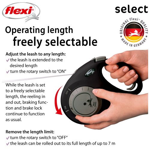 Prvé samonavíjacie vodítko flexi®, u ktorého je možné maximálnu dĺžku voľne nastaviť medzi 0 a 7 metrami, vďaka čomu je flexi® Select ideálny pre prechádzky v meste aj v lese.