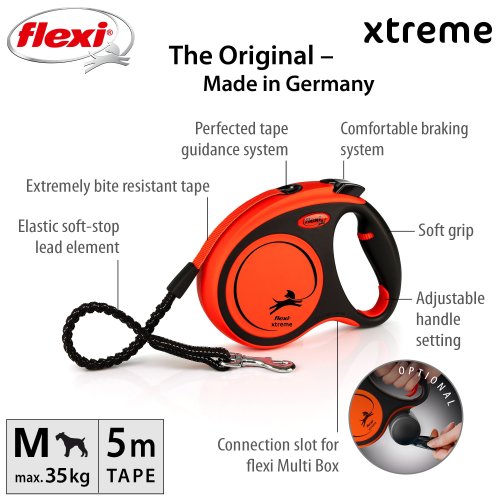 Extrémne odolné vodítko nielen pre milovníkov adrenalínu. Či už je Váš štvornohý parťák obzvlášť aktívny alebo vás čakajú dobrodružné výzvy, flexi® Xtreme ponúka ešte väčšiu bezpečnosť s extrémne odolným pásikom flexi® X11 a viac pohodlia vďaka integrovanému tlmiču Soft-Stop . K väčšiemu bezpečiu pripieva aj výrazná farba, ktorá je ľahko rozpoznateľná z diaľky aj za súmraku. Pretože čím dlhšie je vodítko, tým dôležitejšie je, aby bolo dobre viditeľné. Pre vaše pohodlie disponuje flexi® Xtreme vo veľkostiach M a L nastaviteľnou rukoväťou. Rukoväť je možné prispôsobiť veľkosti Vašej ruky pre pevný úchop na každej prechádzke. Samozrejmosťou je aj nespočetnými testami zdokonalený výstup a vedenie pásky všetkými smermi bez zasekávania.