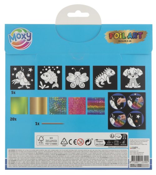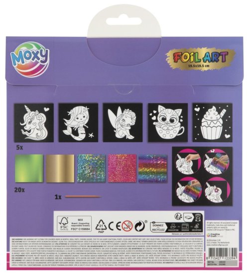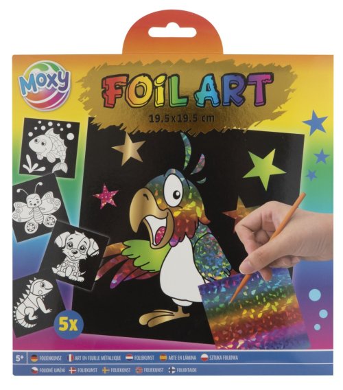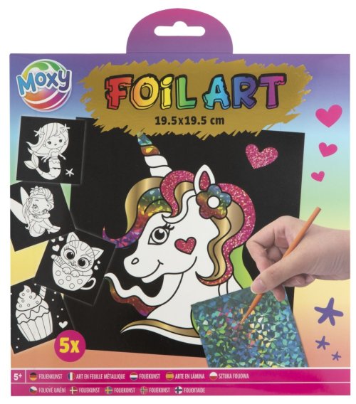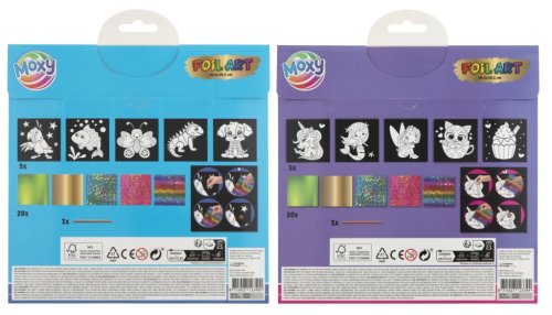 Fóliové maľovanie – balenie obsahuje 5 obrázkov so samolepiacou plochou, 20 žiarivých fólií s rôznymi motívmi a pero. Postup – najprv odlepte časť obrázku a nalepte na ňu vybranú fóliu na lepiacu časť. Priloženým perom zatlačte na fóliu a týmto spôsobom si urobte celý obrázok. Dva rôzne druhy.