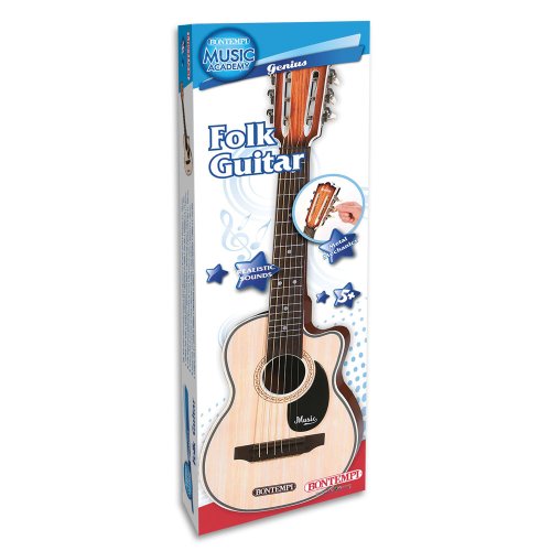 Folková gitara s 6 kovovými strunami, kovovou mechanikou, realistickým zvukom a trsátka.