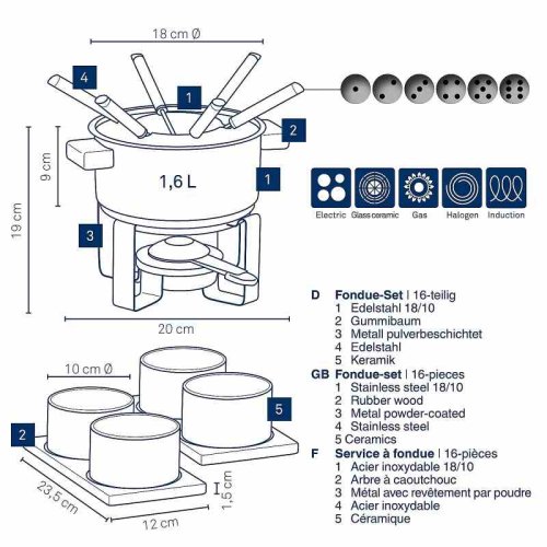 Praktické použitie: Vhodné na indukciu a obsahuje všetko potrebné na prípravu fondue.