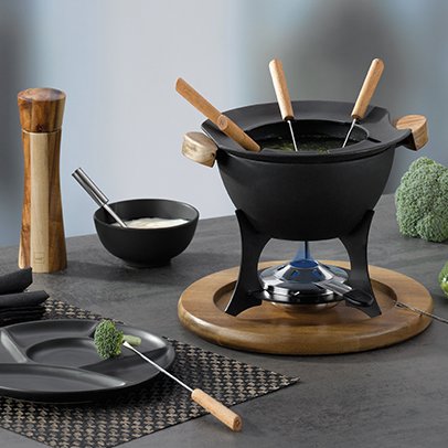 - materiál: liatina / kov / agátové drevo - set obsahuje 11 častí: - liatinová nádoba objem 1 L - kovová pokrievka / držiak na vidličky - kovový stojan - tácka z agátového dreva - horák - 6x fondue vidlička s rozlíšením - ...