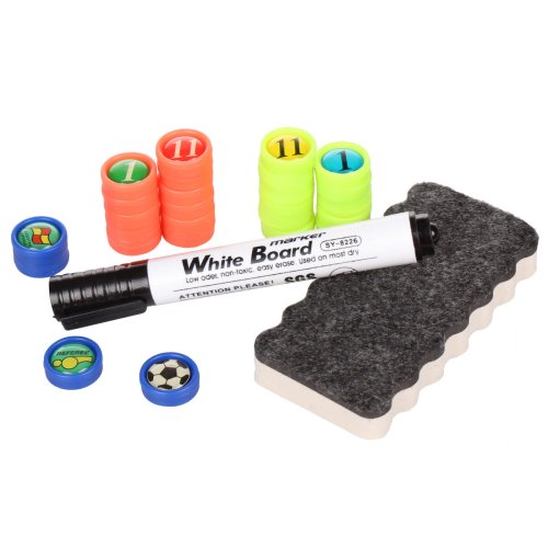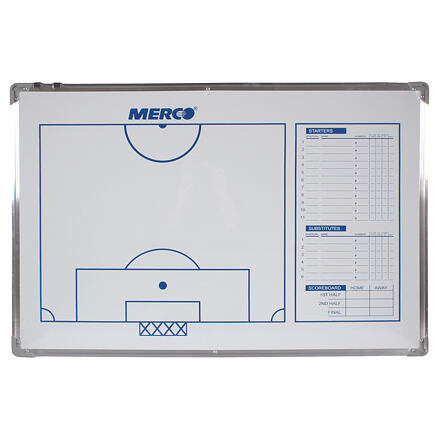 Futbalová trénerská tabuľa je užitočným asistentom trénerov naprieč všetkými súťažami. Taktická tabuľa Merco Football 90 je magnetická doska s dvoma sadami magnetov pre plánovanie a analýzu výkonov hráčov. Obojstranne magnetická tabuľa zobrazuje futbalové ihrisko na jednej strane. Na druhej strane je z dvoch tretín znázornená polovica ihriska a tabuľka pre súpisku hráčov. Súčasťou tabule Football 90 sú dve sady číslovaných magnetov 1 - 11 a štyri ďalšie magnety reprezentujúce rozhodca a loptu, súčasťou je aj čierny popisovač a hubka pre detailnejší popis hernej stratégie. Tabuľa je usadená v alumíniovom ráme s rozmermi 90 x 60 x 2 cm a má hmotnosť približne 2 kg. Na hornom okraji tabule sú dva háčiky na prípadné zavesenie na stenu. Odovzdajte potrebné inštrukcie vašim hráčom pomocou trénerskej tabule zrozumiteľným a jasným spôsobom vďaka taktickej tabuli Football 90.