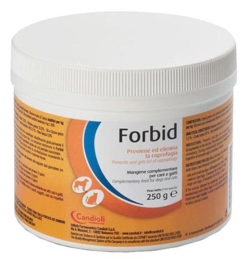 Forbid – nutričný doplnok pre psy a mačky na prevenciu a odstránenie koprofágie (pojedanie výkalov). Indikácie: Forbid obsahuje špecifické rastlinné proteínové extrakty, ktoré spôsobia extrémne nepríjemnú chuť feces (výkalov). Podľa nedávnych klinických štúdií je koprofágia zapríčinená poruchou správania zvieraťa a nie špecifickým deficitom v potrave, ako sa predpokladalo. Terapeutický prístup tu musíme smerovať k zmene chovania zvieraťa tým, že sa mu feces stane nepríjemným. Substancie obsiahnuté vo forbide urobia feces pre zviera úplne odporné. 85% šteniat postihnutých touto poruchou správania prestalo po liečbe Forbidom koprofágiou trpieť. V priebehu antiparazitárnej liečby zabraňuje Forbid požitie trusu a tým reinfestácii parazitárnych vajíčok obsiahnutých vo feces. Zloženie: Cerálie, minerálne látky a vitamíny - intergrácia na kg: vitamín E (90% alfatokocoferol) 1 500 mg. Dávkovanie: Namiešajte s krmivom a podávajte najmenej 15 dní v nasledujúcich dávkach: Mačky a malé psy – polovica čajovej lyžičky. Stredné a veľké psy – 1 čajová lyžička.