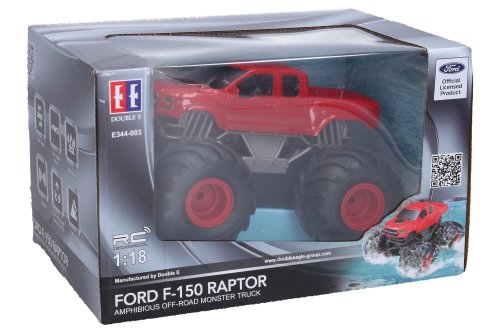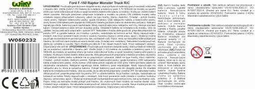 Ford F-150 Raptor Monster Truck plávací červený RC na diaľkové ovládanie. Rozmery 20,2x17,2x13,2 cm. Frekvencia 2.4GHz. Batériový pack 3.7V 500mAh do auta súčasťou, 2xAA do ovládača nie sú súčasťou. Tlačidlo (prepínač) ON/OFF na spodnej strane auta. Ovládač - pohyb dopredu a dozadu, otáčanie vľavo a vpravo, prepínač ON/OFF, 2 tlačidlá na trimovanie kolies. Nabíjanie 3 h.