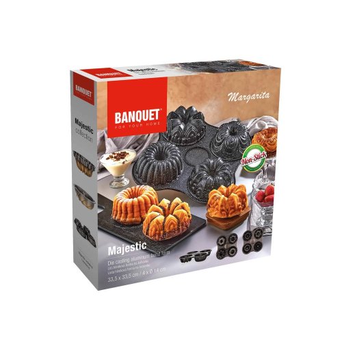 Liata hliníková forma na pečenie na 4 malé bábovky s priemerom 14 cm, MAJESTIC Margarita s nepriľnavým povrchom, na pečenie trených, kysnutých a piškótych ciest. Je vhodná pre elektrické, plynové aj teplovzdušné rúry.
