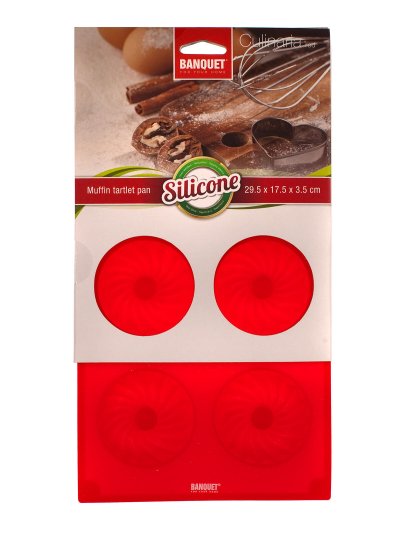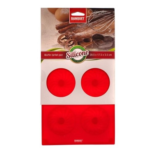 rozmery: 29,5 x 17,5 x 3,5 cm horný priemer jednej bábovky: 6,5 cm dolný priemer jednej bábovky: 5 cm materiál: silikón farba: červená