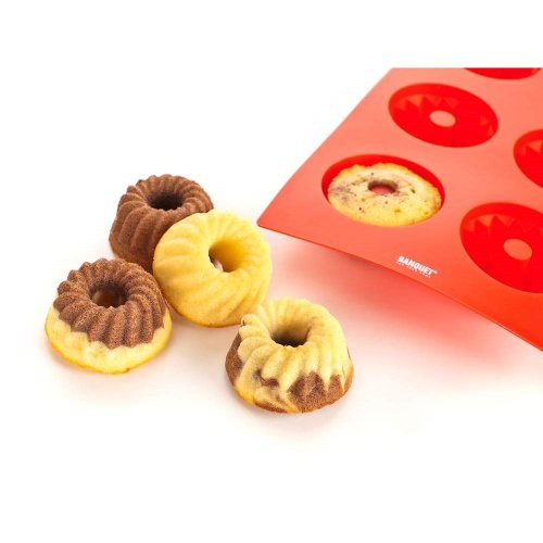 Silikónová forma na 6 ks mini báboviek CULINARIA Red. Forma je odolná vysokým teplotám (do 230 st.C) , neviaže chute ani pachy pokrmov, ľahko sa udržuje (možno umývať v umývačke riadu). Silikón je veľmi populárny materiál, ktorý pre svoje jedinečné vlastnosti našiel svoje uplatnenie aj v kuchyni. Vyrábajú sa z neho rôzne druhy foriem na pečenie, vály a valčeky na cesto, stierky, mašlovačky, rôzne druhy kuchynské náčinie a mnohé ďalšie výrobky.