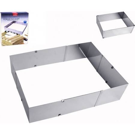 Posuvná forma na pečenie tort rôznych veľkostí. Jedna forma postačí na vytvorenie niekoľkoposchodových tort. Obdĺžnikový tvar. Nerezový materiál. Rozmery 24/47 x 20/38 x 6 cm. EAN 8592381067168