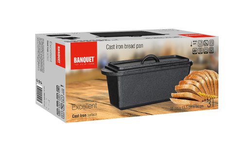 Liatinová forma na chlieb EXCELLENT s vekom, v čiernej farbe. Hranatý pekáč je ideálny nielen na pečenie chleba. Liatina zaistí rovnomerné prepečenie čím dodá chlebu nezameniteľnú zlatú chrumkavú kôrku. Masívny materiál, ktorý akonáhle sa nahreje, vydrží dlho a rovnomerne rozvádza teplo, vďaka ktorému sa pokrm v liatinovom pekáči upečie rovnomerne, za kratšiu dobu a úspornejšie. Pred prvým použitím naneste na povrch pekáča rastlinný olej a postupne ho začnite ohrievať v rúre (začnite na miernom ohni a pomaly zvyšujte teplotu). Zapečením oleja získa výrobok svoju nepriľnavosť. Liatinová forma je ideálnym pomocníkom vo vašej kuchyni. Môžete v nej piecť akékoľvek pečivo, buchty, pizzu, ale aj zapekať zemiaky, zeleninu a pod.