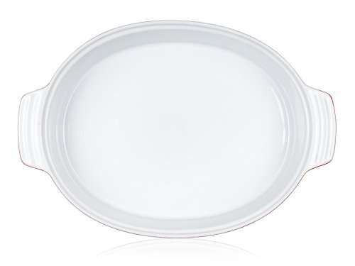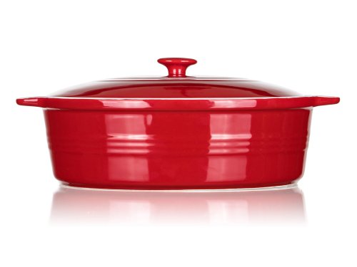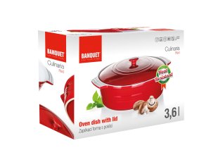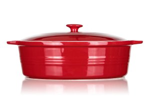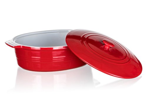 Keramická oválna zapekacia forma s vekom CULINARIA Red, s praktickými držadlami pre jednoduchú manipuláciu,. Vonkajšia strana červená + vnútorná strana biela glazúra. Keramické formy rovnomerne absorbujú teplo a postupne ho uvoľňujú, vďaka čomu sa pokrmy dobre prepečú. Nie je vhodné na použitie na platni sporáka.