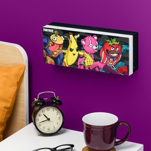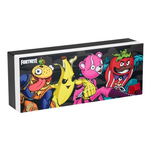 Ľad svetlo s motívom populárnej hry Fortnite predstavuje zaujímavý doplnok do detskej izby alebo herne. Svetlo má tvar obdĺžnikovej krabičky a je zdobené výraznou grafickou potlačou niekoľkých charakterov z tejto hry, medzi ktorými sú napríklad postavy v tvare banánu, medvedíka alebo paradajky. Farebné prevedenie je živé a kontrastné, čo zaisťuje výrazný vizuálny efekt aj za zhasnutého svetla. Svetlo je lemované bielym okrajom, ktorý jemne rozptyľuje osvetlenie a podčiarkuje celkový dizajn.