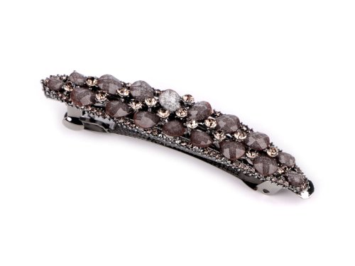 Francúzska spona zdobená akrylátovými brúsenými kameňmi luxusne ozdobí váš účes. Má nádherný lesk, ktorý priťahuje pozornosť. Luxusne ozdobí slávnostný účes. Či už máte jemné pramene alebo husté kučery, touto sponou ľahko zopnete vlasy do vrkoča alebo vytvoríte elegantný drdol, ktorý bude vyzerať, ako keby ho vytvoril profesionál. Spona má veľmi kvalitné celokovové prevedenie. Zacvakávací mechanizmus je pevný. Dĺžka časti pre vlasy je 5 cm.