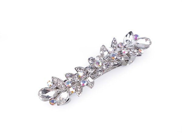 Francúzska štrasová spona s kvetmi luxusne ozdobí slávnostný účes. Má veľmi kvalitné celokovové prevedenie. Zacvakávací mechanizmus je pevný. Spona je zdobená sklenenými kameňmi, ktoré sú vyskladané do tvaru rastlín. Brúsené kamienky s AB efektom sa oslnivo trblietajú, upútajú pozornosť už z diaľky. Dĺžka časti pre vlasy je 3,5 cm.