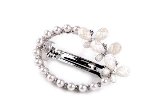 Francúzska spona s perlami a brúsenými kamienkami je ozdobená motýlikmi. Dokonale ozdobí slávnostný účes, či už sa chystáte na svadbu, večierok alebo romantickú večeru. Vášmu vzhľadu dodá kúzlo a eleganciu, môžete ju využiť na upevnenie vlasov do zložitých účesov alebo na jednoduché stiahnutie prameňov dozadu. Má kvalitné celokovové prevedenie, zacvakávací mechanizmus je pevný. Dĺžka časti pre vlasy je 3,5 cm.