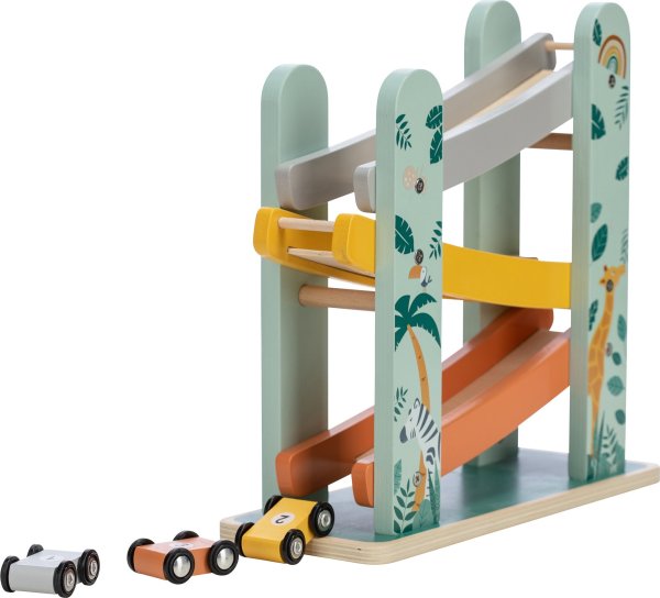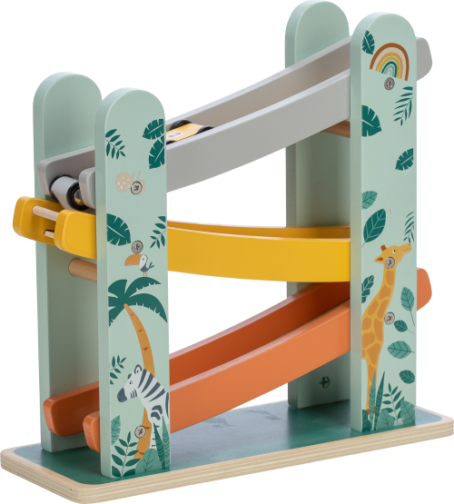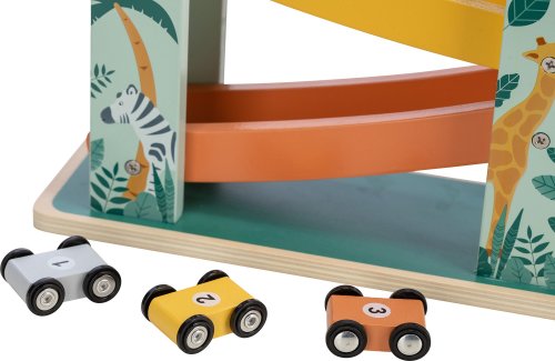 Na značky, pripraviť, štart! Táto drevená kaskádová závodná dráha ponúka priestor na zmeranie rýchlosti 3 autíčok. Z jedného poschodia na druhé, autíčka robia premety a len pozerať na ne je zábavné.