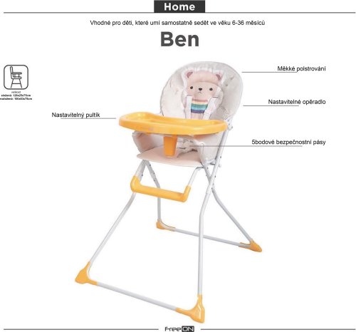 Vysokú stoličku Ben s polstrovaním pre pohodlnejšie kŕmenie a hranie je možné úplne prispôsobiť potrebám dieťaťa vďaka nastaviteľnému operadlu a výške sedátka. Vlastnosti: