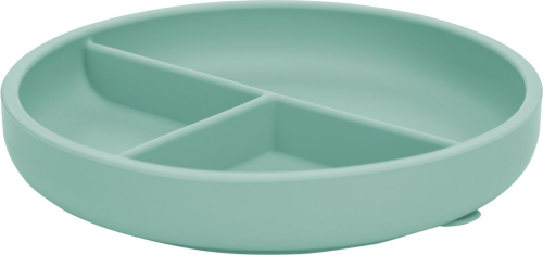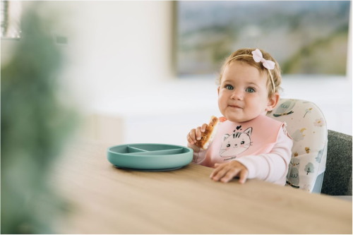 mäkký a ľahký, s prísavkou - vhodný na samostatné jedenie, ideálny na použitie doma aj na cestách, vysoko kvalitný potravinársky silikón, ľahké čistenie, bez obsahu BPA, vhodné do mikrovlnky po dobu max 2 minút, rozmery: 18 x 18 x 4 cm, pre deti od 6 mesiacov.