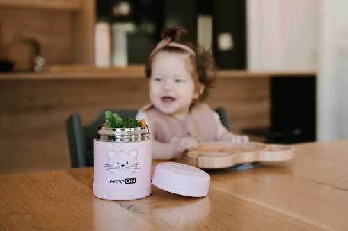 ideálny objem 350 ml pre detské jedlo ľahko sa otvára a zatvára s dvojitou nerezovou stenou veľmi dobre tesní veľký vstupný otvor pre ľahké plnenie vhodná na použitie vo všetkých ročných obdobiach udrží nápoje teplé po dobu 12 hodín a studené až 24 hodín s motívom mačičky