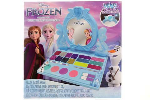 Toto krásne kozmetické štúdio inšpirované obľúbenou rozprávkou Frozen obsahuje 4x tvárenku, 8x trblietavé očné tiene, 6x trblietavý lesk na pery, 6x aplikátor a zrkadlo (v hornej časti svieti). Napájanie na 3x gombíkovú batériu (súčasťou balenia). Balené v krabici. Rozmery balenia 29,5x29,5x4 cm. Odporúčaný vek 13+