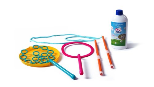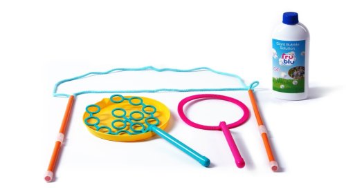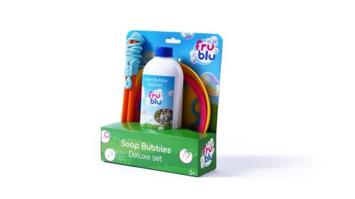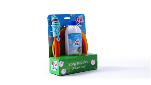 Set obsahuje šnúru pre obrovské bubliny, veľkú obruč, „stromček“ s 12 dierkami, tácku a 0,4L náhradné náplne. Bubliny FRU BLU dosahujú obrovské rozmery a majú neskutočné tvary. September všetkými farby dúhy. Bubliny FRU BLU vznikajú vďaka špeciálnej tekutine, ktorá je produkovaná v EÚ. Sú trvanlivé a len tak neprasknú.