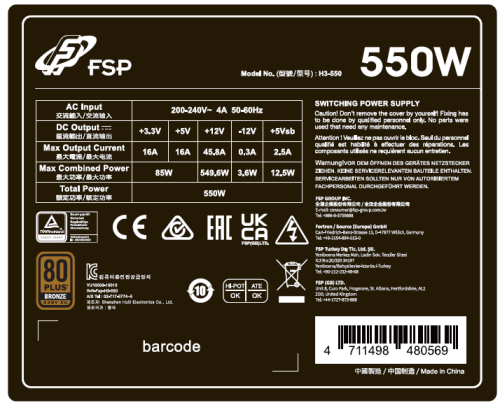 Technické parametre Model: H3-550 Výkon: 550W Formát: ATX PFC: aktívny Typ ventilátora: 120mm Rozmery: 150x140x86mm Hmotnosť: 1,255kg Účinnosť: ≥85% pri typickej záťaži Vstupné napätie: 200-240V Vstupný prúd 50-60Hz
