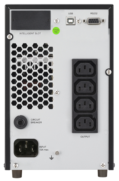 Hlavné vlastnosti: *Dvojitá konverzia *Riadenie mikroprocesorom optimalizuje spoľahlivosť *Korekcia vstupného príkonu *Výkonový faktor 0.9 *Konverzný mód *Režim ECO pre úsporu energie *Funkcia Smart SNMP funguje dobre s USB alebo RS-232 *Komplexný displej umožňuje jednoduché sledovanie a prístup k stavu UPS