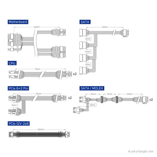 *1x MB 20+4 pin *2x CPU 4+4 pin *1x PCIe 12V-2x6 *4x PCIe 6+2 pin *8x SATA *4x Molex (peripheral)