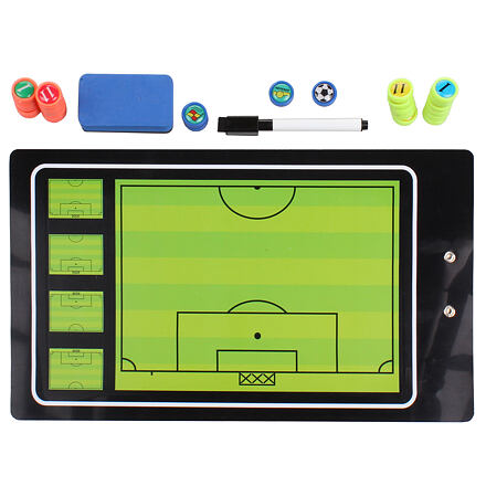 Trénerská tabuľa na futbal je nevyhnutný doplnok každého futbalového trénera naprieč všetkými súťažami. Taktická futbalová tabuľa Merco Futbal 64 je obojstranná magnetická doska s farebným prevedením celého futbalového ihriska na jednej strane a farebným prevedením polovice futbalového ihriska na strane druhej a to vrátane ďalších štyroch miniatúr. Súčasťou futbalovej dosky Merco Futbal 64 je 26 magnetov (s motívmi čísel, lopty a rozhodcov), popisovač, mazacia hubka a klip na ďalšie poznámky. Taktická doska Merco Futbal 64 je najľahšia a najrýchlejšia cesta pre Vaše presné herné pokyny hráčom kedykoľvek počas futbalového zápasu.