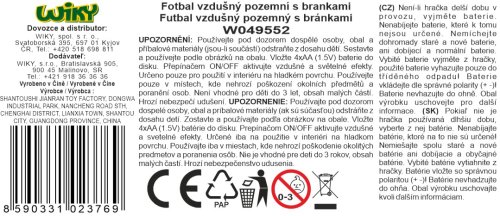 Futbal vzdušný air football. Rozmery disku 18x6x18 cm. Obsahuje 2 bránky. Vydáva svetelné efekty, aktivácia ON/OFF prepínačom na spodnej strane. Batérie 4xAA 1,5V, nie sú súčasťou balenia. Schéma na zostavenie bránky na obale.