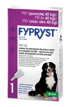 Zloženie: Fipronilum 100 mg v 1 ml roztoku. Použitie: Vzhľadom na absenciu dostupných údajov prípravok nepoužívajte u šteniat mladších ako 8 týždňov a/alebo vážiacich menej ako 2 kg. Nevhodné na použitie u chorých zvierat alebo zvierat v rekonvalescencii. Nepoužívajte v prípade precitlivenosti na účinnú látku alebo na niektorú z pomocných látok. Rozhrňte srsť zvieraťa v oblasti kohútika pred lopatkami tak, aby bola viditeľná koža. Priložte hrot pipety na kožu a niekoľkokrát pipetu stlačte tak, aby sa obsah vyprázdnil priamo na koži v jednom mieste. Prípravok aplikujte na miesto, kde si ho zviera nemôže olízať a zaistite, aby si ho zvieratá po ošetrení neolizovali navzájom. Neaplikujte na rany alebo poškodenú kožu. Nemanipulujte s ošetrenými zvieratami a zabráňte kontaktu detí s nimi, kým aplikovaný prípravok nezaschne. Nepoužívať u mačiek, hrozí predávkovanie. Dávkovanie: Aplikujte na kožu v závislosti od hmotnosti zvieraťa podľa nasledujúcej tabuľky: Fypryst 402 mg spot-on pre psov: Jedna jednodávková pipeta s obsahom 4,02 ml roztoku na nakvapkanie na kožu - spot-on pre psa vážiaceho viac ako 40 kg ž. hm. Jedna jednodávková pipeta s obsahom 4,02 ml roztoku na kvapkanie na kožu - spot-on a zodpovedajúca menšia jednodávková pipeta pre psa s hmotnosťou väčšou ako 60 kg. Minimálny interval opakovanej aplikácie je 4 týždne.