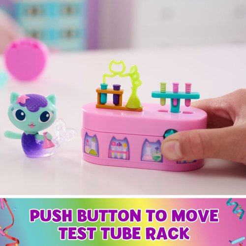 Spojte sa s Rybočkou a užite si vzrušujúce dobrodružstvo v umeleckej dielni kúzelného domčeka. Rybočka je oblečená vo svojom charakteristickom oblečení z Gábininho kúzelného domčeka a spolu s ňou tu nájdete aj jej sadu so skúmavkami a všetky jej mačacie vecičky! Súčasťou sady je aj laboratórny stôl so skrytým aktivačným tlačidlom, keď potom hviezdu stlačíte, skúmavky sa objavia hore na pulte, či zase späť pod ním! Potom rozbaľte domček pre bábiky, rovnako ako Gábina v každej epizóde, a objavte hračku s prekvapením - laboratórne okuliare, ktoré môžete Rybočke nasadiť! Všetky hračky z Gábininho kúzelného domčeka sú navrhnuté tak, aby sa dali vzájomne prepojiť, takže ak sa chcete hrať ešte viacerými spôsobmi, získajte Gábininu výletnú loď, Gábinin mňautastický domček a tematickú izbičku do domčeka, aby ste si ešte viac dotvorili svet svojho kúzelného domčeka (predávajú sa zvlášť) Plyšové hračky, bábiky s doplnkami, figúrky a hracie sady na motív Gábinina kúzelného domčeka sú perfektnými vzdelávacími hračkami pre dievčatá a chlapcov, ktorí radi zapájajú svoju predstavivosť k vytvoreniu svojho vlastného sveta v kúzelnom domčeku, takže sa pripravte na nekonečné dobrodružstvá s touto malou hracou sadou!