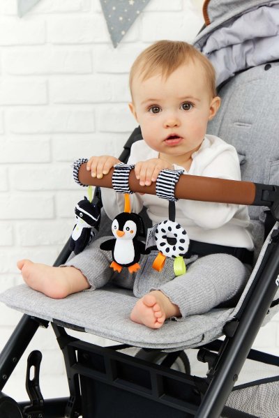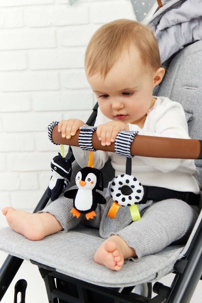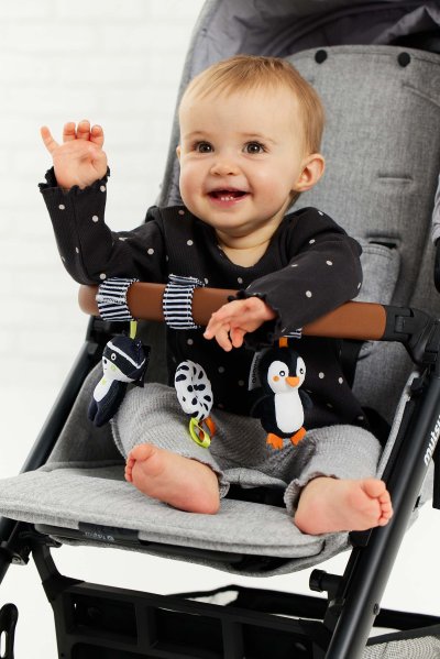 Génius je ten, kto vidí viac ako ostatní. Pokiaľ teda budete zrak svojho dieťaťa od samého začiatku správne stimulovať…. kto vie, čo všetko bude schopné rozpoznať! Pre začiatok budú vhodné závesný plyšový Mýval, Tučniak a Donut. Závesná plyšová hračka GaGaGu má kontrastné farby a vzory, ktoré stimulujú zrak dieťaťa. Plyšové prvky – opice, panda a lopta – a stuhy nabádajú deti, aby ich uchopili a podporili tzv. jemnú motoriku (pohyby prstov a rúk) a učenie motorickej koordinácie. Pohodlný spôsob zapínania na suchý zips (príjemný na dotyk a ľahké zapínanie) vám umožní prívesok pripevniť kamkoľvek, napríklad na kočík, na postieľku, na hojdačku alebo autosedačku. Vek 0+