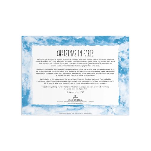 Fóliové puzzle od Michaela Storringsa zobrazuje radosť z Vianoc v uliciach Paríža. Toto puzzle je tou správnou výzvou pre celú rodinu. Časti motívu majú špeciálny povrch, ktorý sa na svetle z rôznych uhlov kovovo leskne a vytvára tak dojem, že je puzzle zo zlata, striebra a ďalších lesklých kovov. Milovníci puzzle určite ocenia všetky zaujímavé detaily, ktoré po zložení vytvárajú krásny obraz, ktorý dodá nádych elegancie každej miestnosti nielen počas Vianoc. Či už hľadáte zábavnú aktivitu pre daždivý deň alebo jedinečný darček pre milovanú osobu, toto puzzle určite urobí dojem. Vďaka svojim zložitým detailom a náročnému dizajnu je toto puzzle ideálne pre každého az puzzle robí krásny a pútavý doplnok do každého domova alebo kancelárie . Hlavné vlastnosti: vyrobený zodpovedne z materiálu s certifikáciou FSCpotlačené netoxickými atramentmi1000 precízne vyrezaných dielikov obsahuje návodný obrázok ® (Forest Stewardship Council) zaručuje, že drevo, z ktorého bol produkt vyrobený, nebolo vyťažené nelegálne a pochádza z lesov obhospodarovaných šetrným či prírode blízkym spôsobom, v ktorom sú dodržiavané prísne environmentálne a sociálne požiadavky. Značka FSC® na výrobku znamená, že svojim nákupom pomáhate chrániť lesy a podporujete šetrné, zodpovedné či prírode blízke hospodárenie, vďaka ktorému sú naše lesy stabilnejšie, zdravšie, majú prirodzenú druhovú skladbu a lepšie odolávajú negatívnym následkom klimatických zmien.