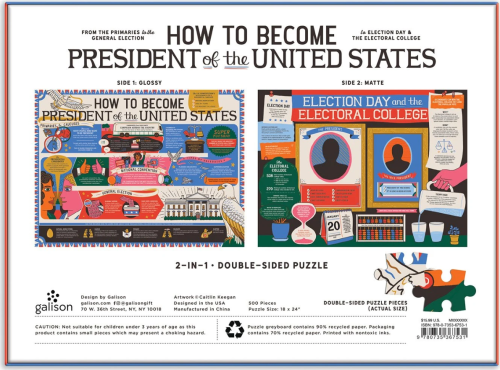 Dvojnásobná porcia! Obojstranné puzzle Vás zoznámi s cestou do prezidenstského úradu od primárok až k voľbám. Balenie obsahuje obrázok oboch motívov. Puzzle má rozdielny povrch - z jednej strany je lesklé, z druhej strany je matné pre ľahšie rozpoznanie motívov. Rozmer zloženého puzzle cca 61 x 46 cm