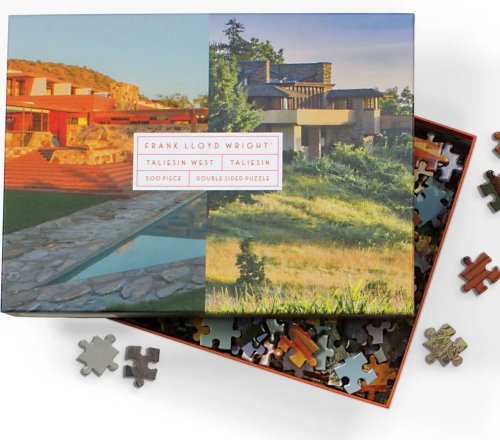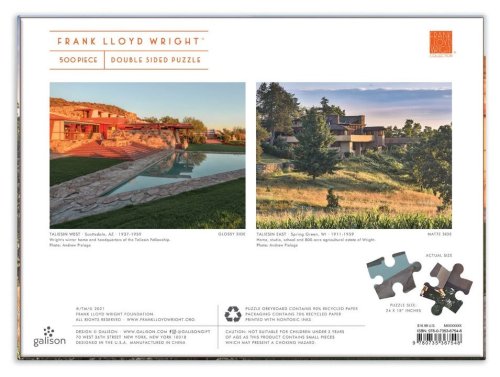 Dvojnásobná porcia! Obojstranné puzzle so slávnymi fotografiami amerického fotografa Franka Lloyd Wright. Puzzle má rozdielny povrch - z jednej strany je lesklé, z druhej strany je matné pre ľahšie rozpoznanie motívov. Rozmer zloženého puzzle cca 61 x 46 cm