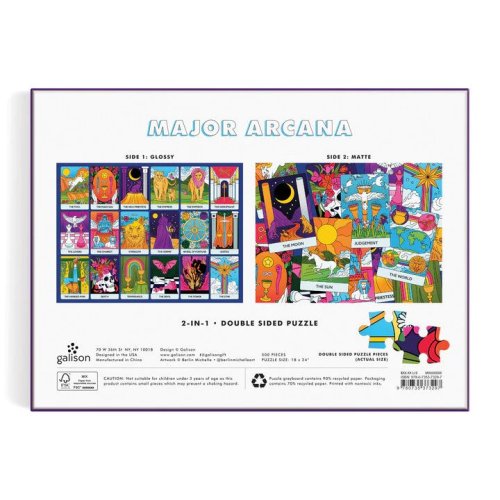 Obojstranné puzzle zobrazuje tarotové karty, ktoré predstavujú životné lekcie a témy. Dieliky puzzle sú na jednej strane matné a na druhej lesklé pre ľahšie skladanie. Puzzle je balené v pevnej krabici, na opätovné použitie a skladovanie. Ideálne ako darček. Autor obrázku je Michelle Berlin. Puzzle sú vyrobené za použitia významného podielu recyklovaného papiera a ponúkajú špičkovú potlač nezávadnými farbami. Sú opatrené matnou povrchovou úpravou, ktorá zaisťuje za všetkých okolností verné podanie detailov i farieb. Ich zadná strana je potiahnutá hladkým, na dotyk príjemným povrchom, vďaka ktorému sa pri skladovaní rozloženého puzzle netvorí prach. Spolu so starostlivo zabalenými dielikmi nájdete v balení aj letáčik s návodným obrázkom, ktorý spravidla obsahuje ďalšie informácie o tvorcoch a pozadí vzniku diela. Dodávané v mimoriadne pevnej a pútavo spracovanej kartónovej krabičke vyrobenej z recyklovaného kartónu a udržateľne získaných materiálov s certifikáciou FSC®. Hlavné vlastnosti: 500 precízne vyrezaných dielikovvyrobených s použitím recyklovaných a udržateľne získaných materiálovstarostlivo vybraný motív od renomovaných tvorcov a umelcovpotlač a prevedenie najvyššej kvalityobsahuje návodný obrázok