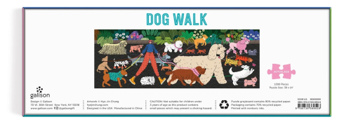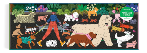 Panoramatické puzzle so životom psov na prechádzke obsahuje farebnú a zábavnú ilustráciu psíčkara s 20 psami na vodítku. logické myslenie a motoriku
